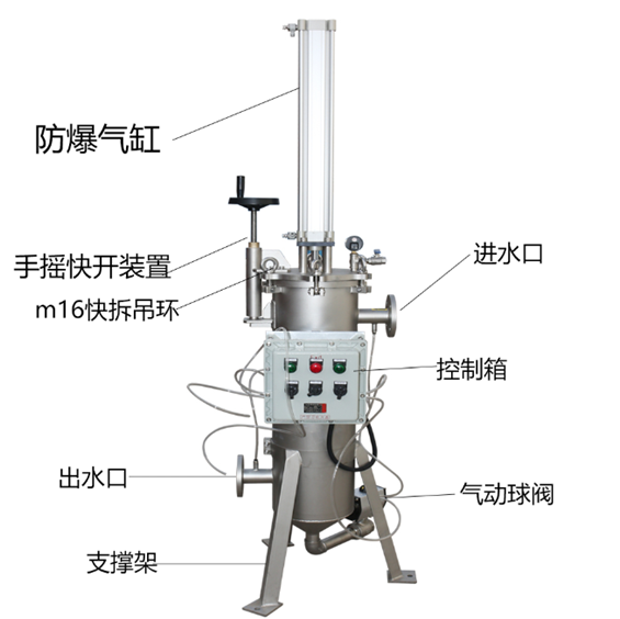 Pneumatic scraper self-cleaning filter, this filter is mainly composed of (explosion-proof cylinder, m16 quick-release lifting ring, manual lifting quick-opening device, cylinder stainless steel 304/316L stainless steel material, explosion-proof control box, electric/pneumatic drain valve, Schneider Electric Components, inlet and outlet flanges of national standard, the interior is composed of stainless steel wedge-shaped mesh metal filter element, stainless steel shaft, and scraper made of polytetrafluoroethylene).