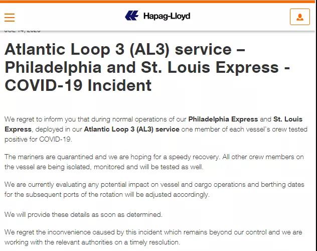 赫伯罗特(Hapag-Lloyd)日前在官网发布公告,其旗下两艘运力3237TEU的集装箱船“PhiladelphiaExpress”号和“St.Louis Express”号在美国港口水域各有一名船员核酸检测结果呈阳性。